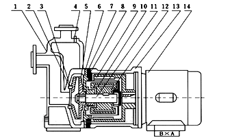 8.隔離層 | 9.外磁鋼總成 | 10.內磁鋼總成 | 11.泵軸 | 12.軸套 | 13.聯接架 | 14.電機 |
